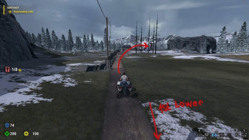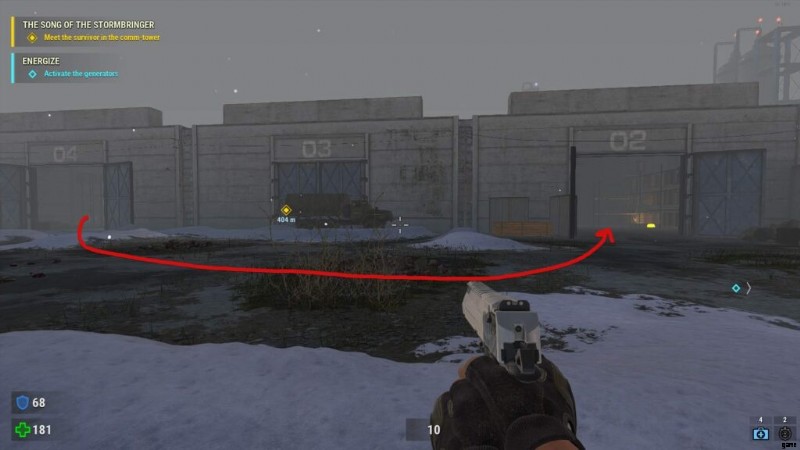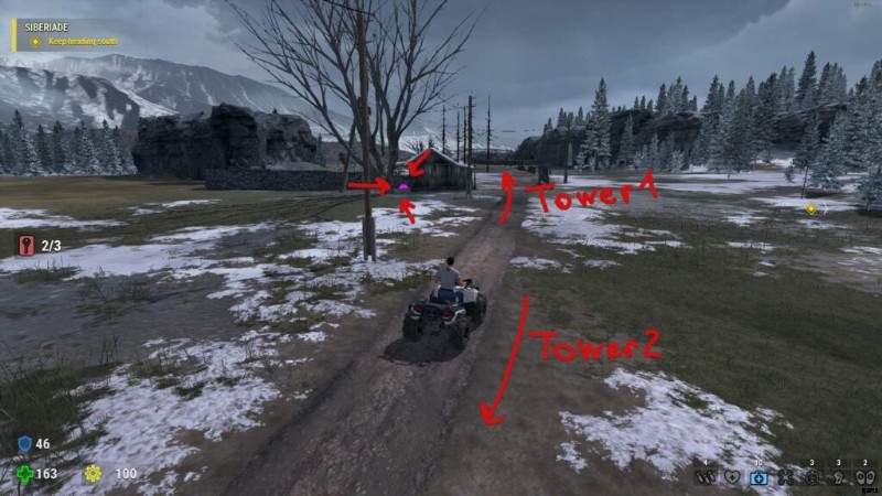 From the first tentacle tower (one straight down the road from the bridge) there’s a silo/tower in the middle of the field. Impossible to miss. Atop – some supplies and an easter egg.