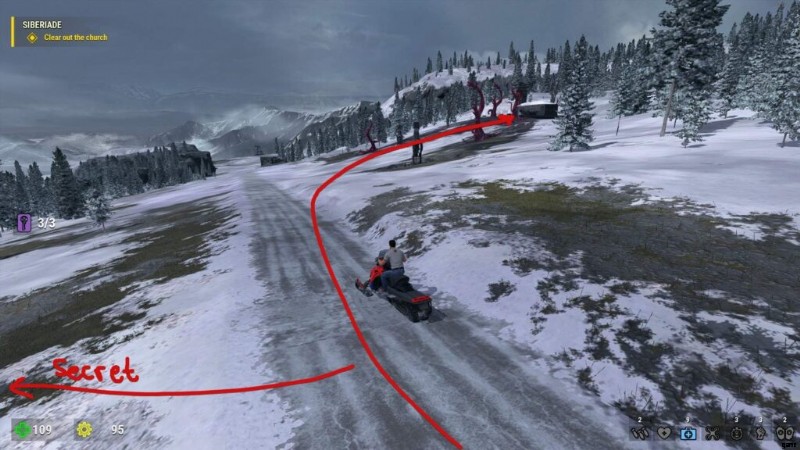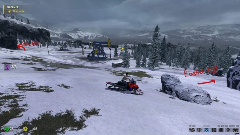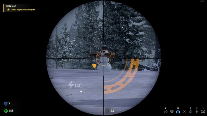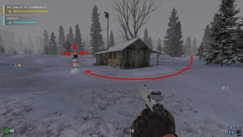 2番目の目的の道を進み、岩の周りを左折できるまで道をたどり、岩の線が終わるまで進み、別の左折して森に入り、かわいい見た目の雪だるまのある小屋に向かいます.その秘密は頭にあります。明らかに、健康な雪だるまを拾うと、爆発してかなりのダメージを与えます。回避できるかは不明。 2 つでは足りませんでしたか?