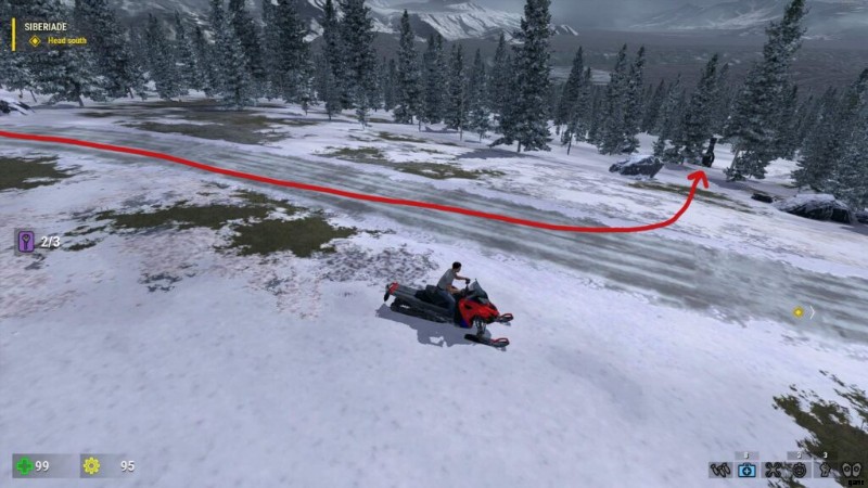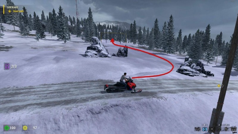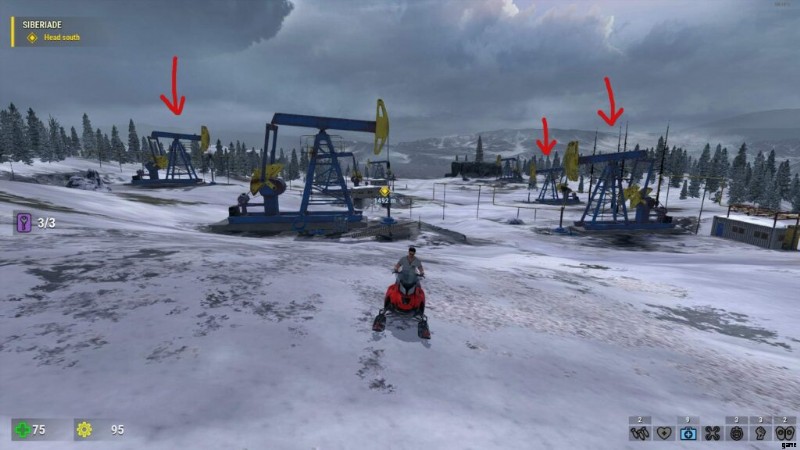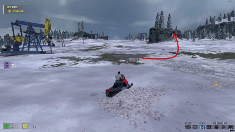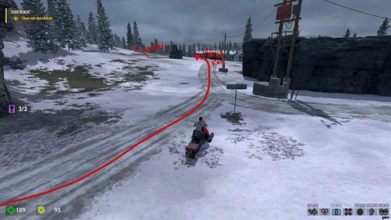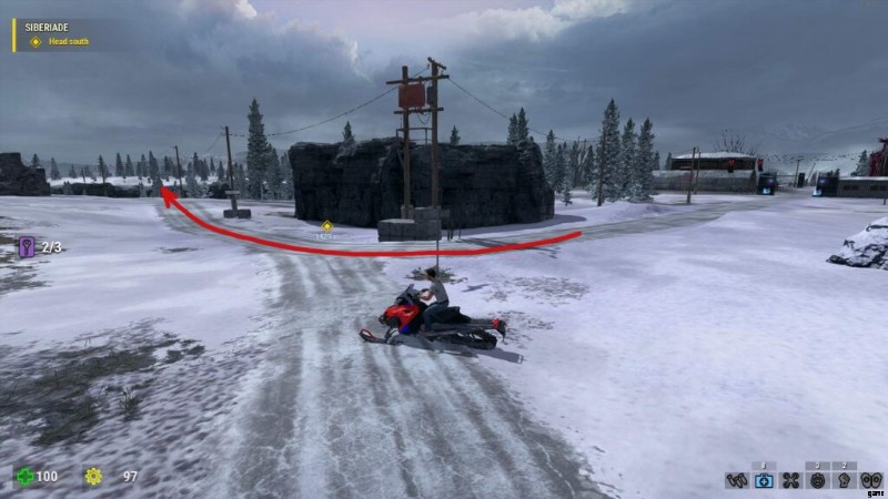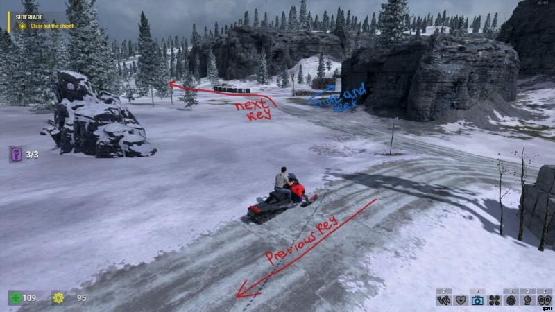 To find first key just follow the yellow gas pipe you’ve been riding along since you got snowmobile. Big outpost has a secret behind the other building.