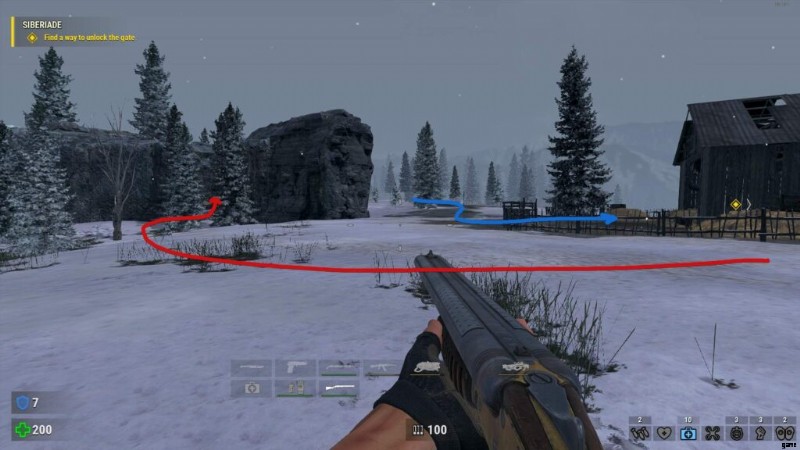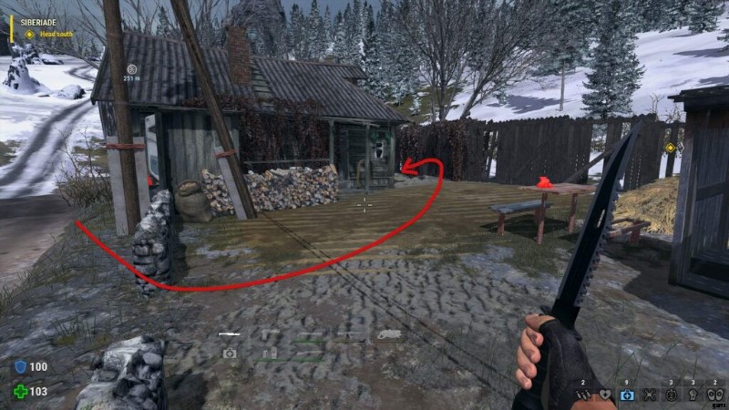 After exiting the village through another gas pipe arch you’ll come upon a fork. Take right, there’s a barn with a tractor in it, check the little shack on the left.