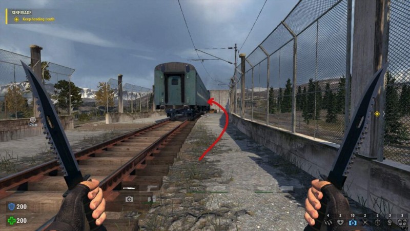 線路を渡って反対側に出たら、2 つ目の道を降りて、レールに沿って輸送用コンテナに向かいます。