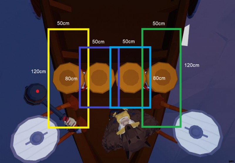 腕のリーチを補うために、外側のドラムを叩く場所にはより多くの許容範囲があります。 2 つの有効な音符があり、真ん中を叩いた場合、どちらの音符が最も近いかを調べて重複を処理します。ヒット ゾーンがどのように見えるかを示す簡単なスケッチを次に示します。