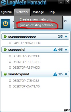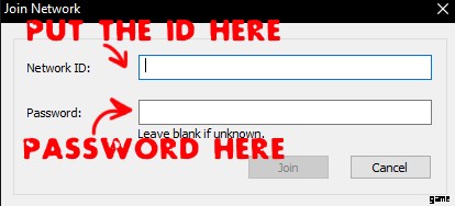 ネットワーク (左上) に移動し、その上にマウスを置き、[既存のネットワークに参加] をクリックします。その後、友達が参加させたネットワークの名前/IDとパスワードを入力します。参照用に下の画像を探してください: