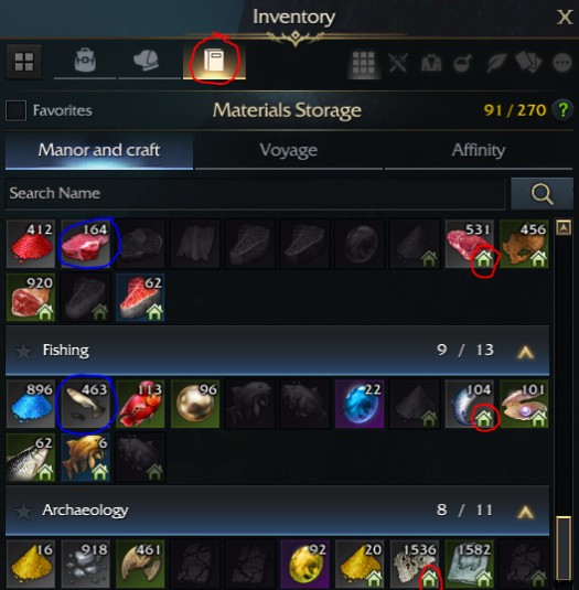 収集材料は特別なインベントリ タブから表示され、「ハウス」アイコンが付いているものは名簿に縛られた要塞材料です