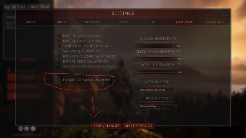 設定、ゲームプレイで、犯罪行為を有効にすることを忘れないでください。そうすれば、PvP を最初に開始できるようになります。
