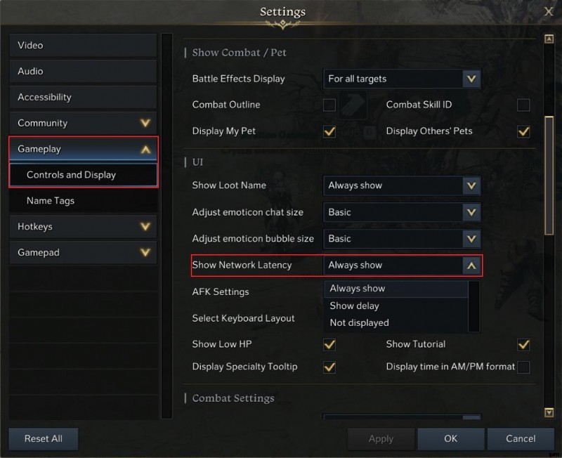 まず、ESC ボタンを押してから、ゲームの [設定] に移動します。そこから [ゲームプレイ]> [コントロールと表示] に進みます。次に、UI サブセクションに到達するまで下にスクロールすると、「Show Network Latency」という行が見つかります。これを「常に表示」に切り替えると、ping が画面の左下に表示されます。