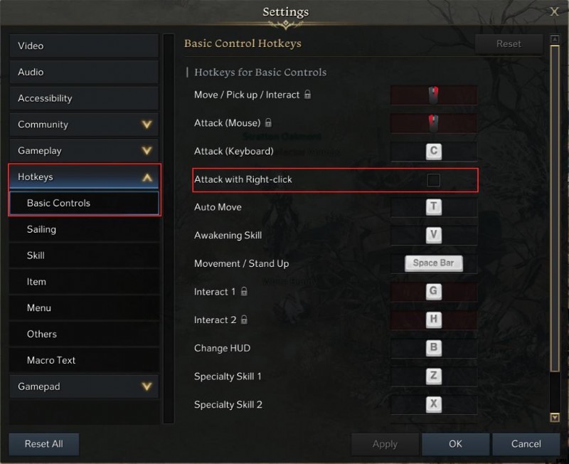 私はRMBを攻撃に、LMBを移動に使用することにあまり慣れていませんでしたが、それらを切り替える簡単な方法があります.もう一度「設定」に移動し、次に「ホットキー」、最後に「基本コントロール」に移動します。そこに「右クリックで攻撃」という行が表示されるはずです。このボックスのチェックを外すと、マウス ボタンが移動と攻撃に切り替わります。