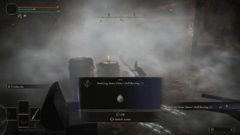 トンネルの入り口を叩き始めるには、先に進む道を明らかにします。最初の敵を通り過ぎて前進し、いくつかの樽、箱、および手押し車によってブロックされた道に沿って最初の右折します.ここの部屋の中にチェストがあります。宝箱を開けて、Smithing-Stone Miner's Bell Bearing を入手してください。