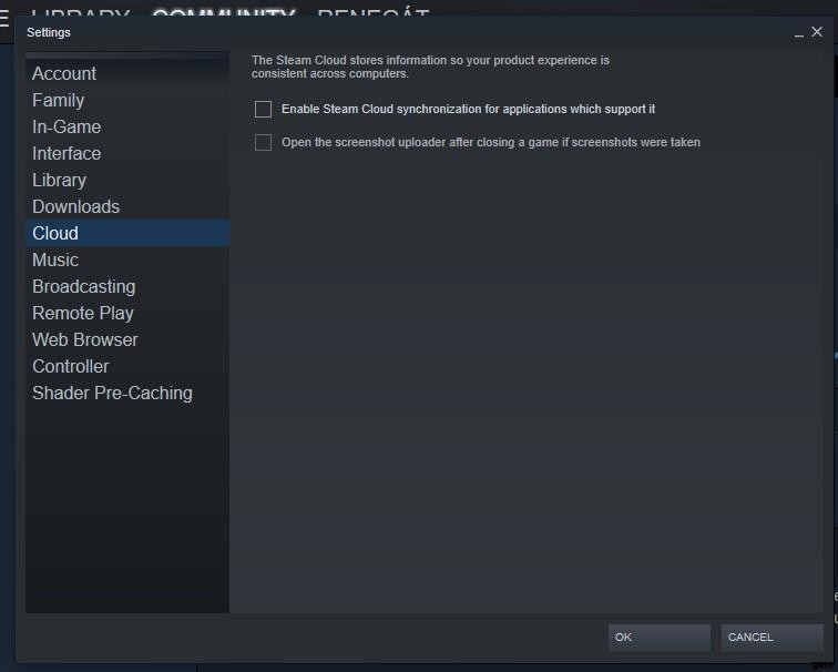 あなたがする必要があるのは、モニター画面の左上隅に移動し、ポップアップメニューの「スチーム」をクリックしてから「設定」をクリックすることだけです。新しいウィンドウが表示されるので、[クラウド] ボタンをクリックし、[それをサポートするアプリケーションに対して Steam クラウド同期を有効にする] のチェックを外します。