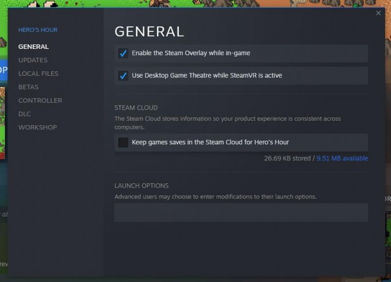 別の方法として、ライブラリでゲームを右クリックして [プロパティ] を選択し、[全般] タブで [ヒーローズ アワーの間、Steam クラウドにゲームの保存を保持する] のチェックを外します。