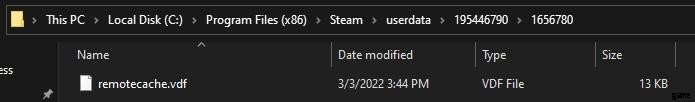 削除するファイルが 1 つあります。それは、コンピューターにまだ保存されている古いクラウドセーブです。ファイルの場所は、特定のアプリ ID の下の Steam の Userdata フォルダーになります。検索バーの写真の下にルートが表示されます。ここに「remotecache.vdf」ファイルが表示されます。これを削除する必要があります。