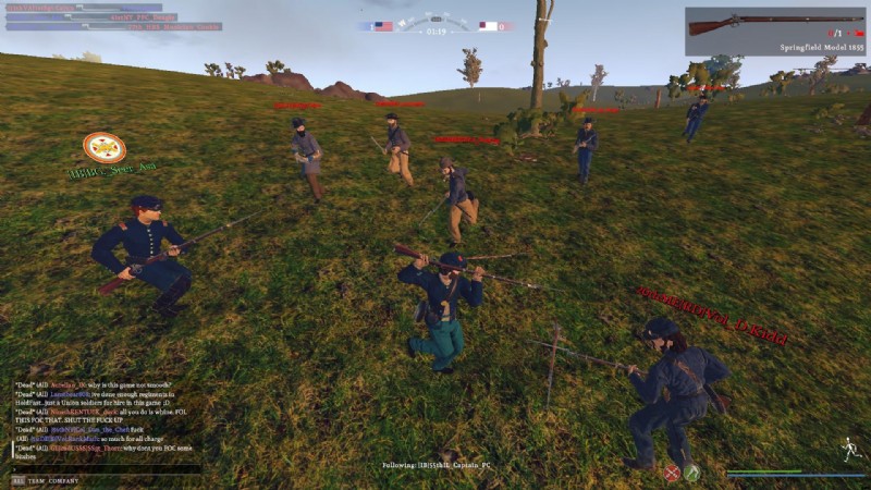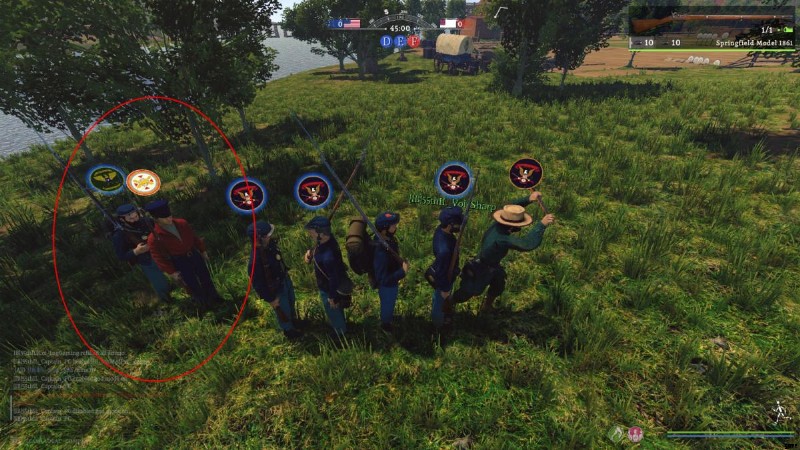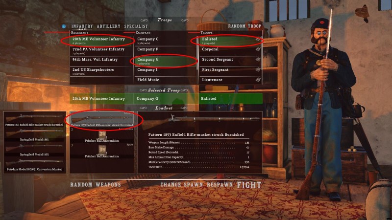 割り当てられたら、指定されたチームを選択します。砲兵、小競り合い、または騎兵であると指定されていない限り。あなたは戦列歩兵です。あなたの指揮官は、あなたがどの連隊と中隊として行くかを選ぶべきです。また、好みがある場合は、特定の武器を選択する必要があります。ミシシッピライフルなどの一部の武器は戦列歩兵には許可されていません。迷ったらSpringfield Model 1861をどうぞ。