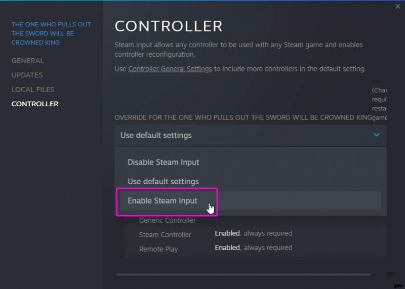 「コントローラー」タブで、「Steam 入力を有効にする」を選択します。