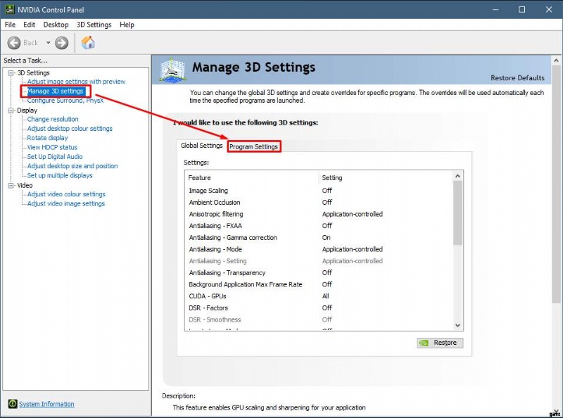 - 3D 設定に移動し、プログラム設定を選択します。