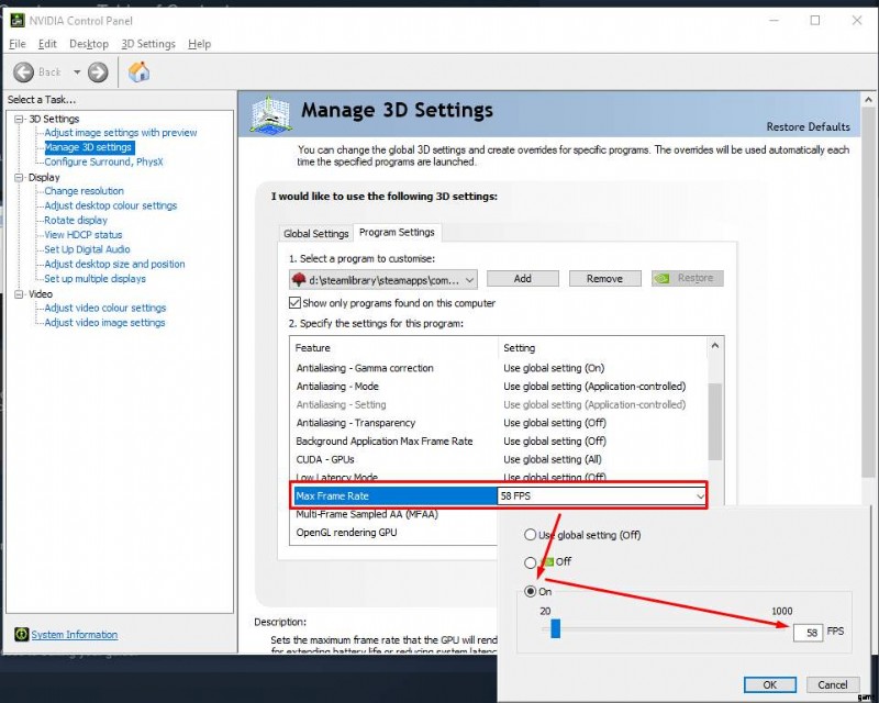 最大フレーム レートまで下にスクロールし、58 FPS に設定します (60 Hz モニターなので、上限より 2 FPS 低くします。ご使用のモニターのリフレッシュ レート/設定に基づいて、独自の FPS を設定してください)。