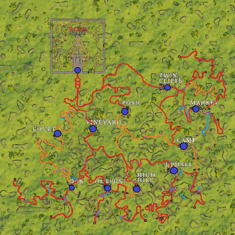 - VINEYARD->Big Castle™ は間違いなく Big Castle™ への最速のパスであるため、VINEYARD につながるすべてのパスが選択されます。このため、VINEYARD は最も行動的で危険な 2 番目の町になる傾向があります。