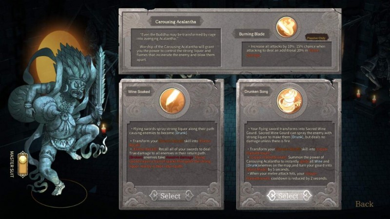 この宗派には正式名称がありますが、私はずっと火の宗派と呼んでいます。ほとんどの人にとって、第1章のボスを倒した後にロックが解除されるのは2番目の宗派です.ワインに浸したものよりも酔った歌をお勧めします。 Wine Soaked は 2 つのオプションの中でより一般的であり、敵が少ないためゲーム序盤と低難易度でより強力ですが、高 HP の敵が多く、シースを減らすことができないため、高難易度ではゲーム中盤から後半に苦労します。セブンソードセクトのようなクールダウン。敵に6本の剣を投げ、リコールしてさらに6本投げます。おそらく、そのうちの2つを殺して、さらに10本が走っているので、近接攻撃を使用してのみ殺すことができます.また、燃焼状態の影響を受けるのは 10 個のうち 2 個だけです。