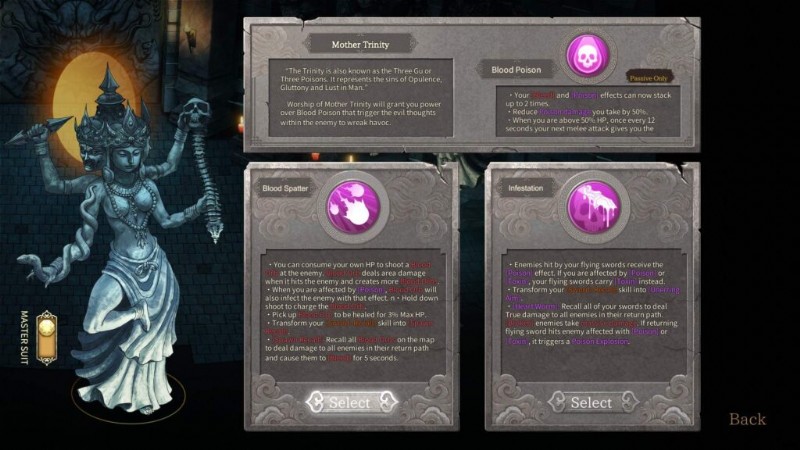 マザー トリニティは出血/毒の宗派で、一定量の本の顔を殺すとロックが解除されます。そのため、プレイヤーごとに異なるタイミングでロック解除できますが、私は火と飛行剣の宗派の間でロックを解除したので、ここに置きます。