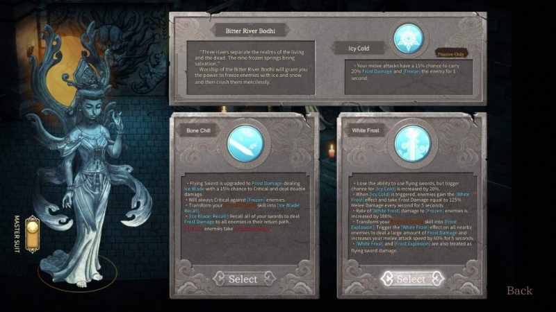Bitter River は、チャプター 3 をクリアした後にロックが解除され、凍結効果を中心に展開します。アイスブレーカーの牙は、凍結している敵に対するすべてのダメージを2倍にし、ダメージを与えたときにボス以外の敵を5%の確率で即死させるため、このビルドには重要です. 2 つのパスのうち、Bone Chill よりも White Frost をお勧めします。これは、継続的にダメージを与え、Ice Breaker Fang の効果もトリガーできるからです。また、近接攻撃でフリーズをトリガーする可能性を高め、シース アビリティで攻撃速度を上げ、敵がフリーズする可能性をさらに高めます。また、Bone Chill ブランチは、Wine Soaked や Infestation と同じ問題に遭遇します。これは、ヒット時にシースのクールダウンを短縮できないことです。