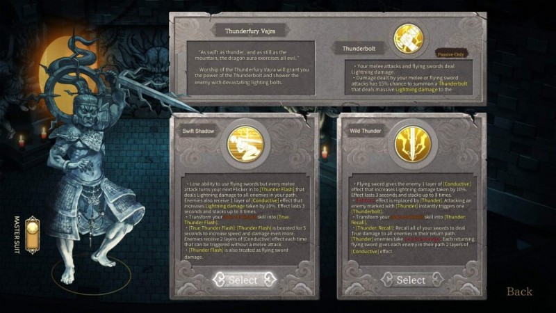 この宗派の目的は、導電性のスタックを適用し、サンダーボルトをトリガーし続けることです。 2つのうち、Swift ShadowはWild Thunderよりも速く、より多くの敵に導電性を適用できるため、より高い難易度とゲーム後半でより優れています.また、サンダー フラッシュにより、ワイルド サンダーよりも物理的に高速です。そうは言っても、この宗派はInfinite Arhatとほぼ同じくらい鞘のクールダウンの短縮を優先しています.また、Swift Shadow で右クリックすると、飛んでいる剣がないため、プレイヤーはダッシュします。ただし、手にやさしいので、スペースバーを使用することをお勧めします。これは私が片手でプレイする唯一の宗派でもあります。完全なビルドになると、攻撃をやめ、ちらつきを使用してすべてのダメージを与えるからです。