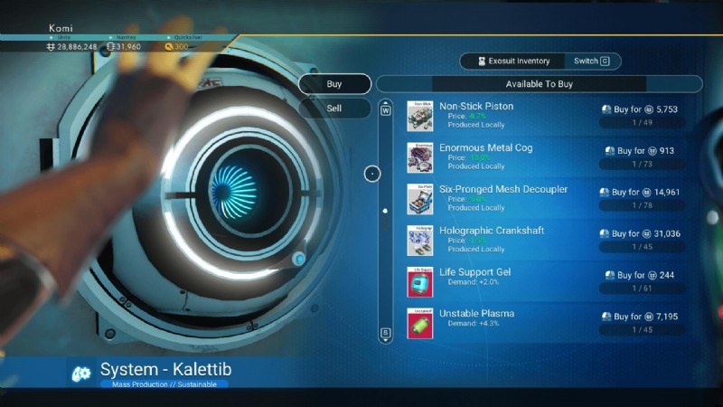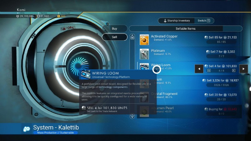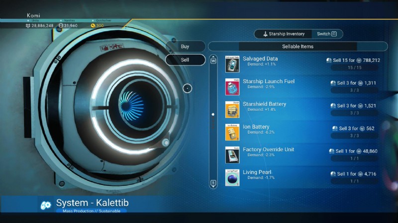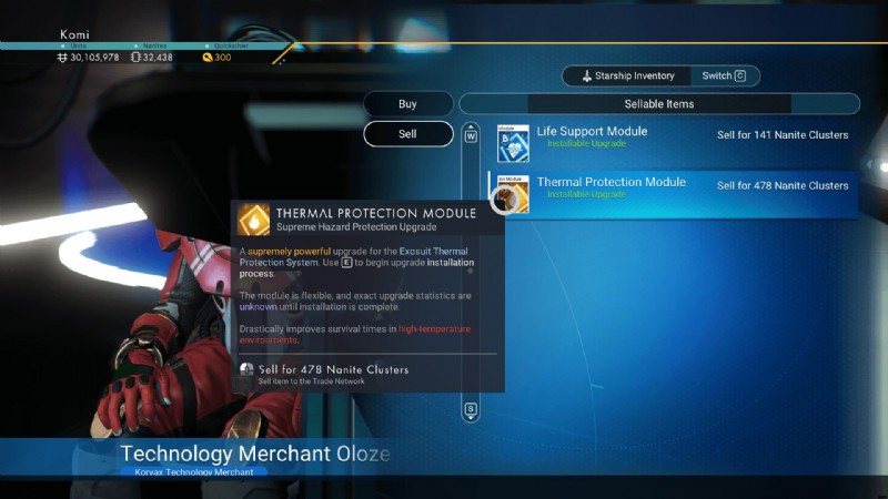 Nanites の場合は、まだ開封されていないアップグレード モジュールを購入または検索し、手順を繰り返します。ただし、船/マルチツール/エクソクラフト/バックパック アップグレード マーチャントに行き、まったく同じ方法で販売してください。