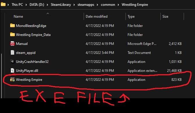 - wrestling empire.exe を見つけます。この PC> ストレージ デバイス (おそらく C:)> SteamLibrary> Steamapps> Common> Wrestling empire の下にあります。これは画像にあります。