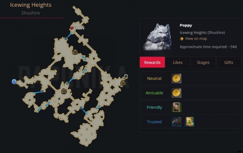 この信頼関係をできるだけ早く高めるには、Totopia の愛情エモートが必要です。手に取りやすいので汗をかきません。贈り物がなければ、ポピーの関係を完成させるのに 34 日かかります。これを達成すると、かわいい子犬のマウントも付与されます。