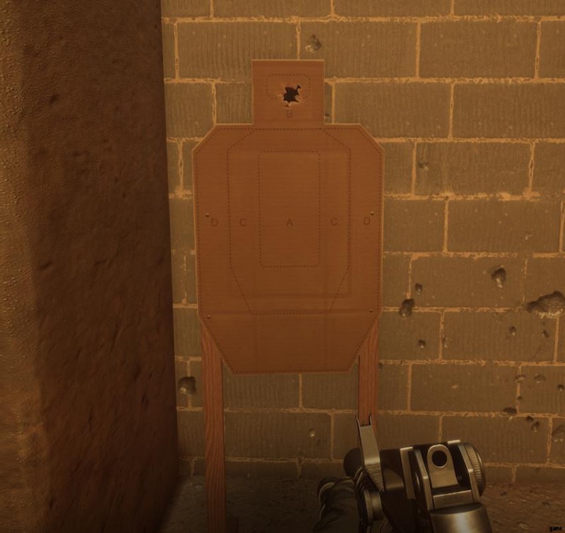 次に、どの武器でも射撃場に行きます。ピストルが最も正確です。具体的にはusp 45が好きです。キルハウスのこの特定のボードに移動し、頭のAボックスで撃ちます。失敗した場合は、ゲームを再起動する必要があります.