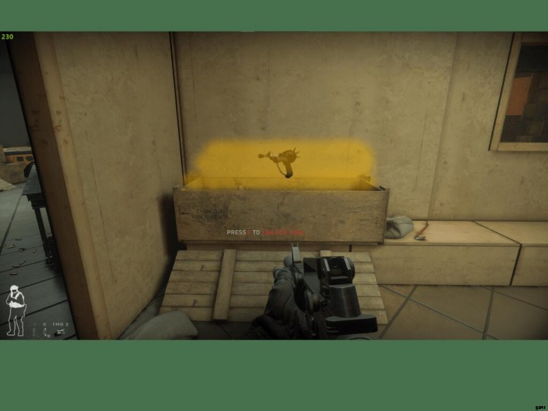 ステップ 3 他に何も撃たずにキルハウスを出て、非致命的なトレーニングと並行してボックスに移動します。これで、輝きが増し、その上に武器が浮かんでいます。これは、コール オブ デューティーからの古い楽しいイースターエッグであり、ファイナルにはなりませんでした。ビルド、最も興味深いことの 1 つは、2019 アルファより前の古いアルファ テキストを使用していることです。実際には、2018 年のトレーラー ゲーム プレイ ビルドでは、f を押して射程のそばの武器スタンドに向かいます。何かが表示されない場合は注意してくださいが間違っているため、再起動して再試行する必要があります。