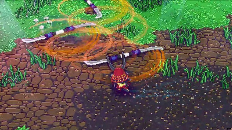 - 武器投げ: 両刃の剣にリバーススライス4つとステップ1つを装備すると、回転武器を投げて攻撃することができます。投げた後も通常通り攻撃できるので、投擲武器としても重宝します!