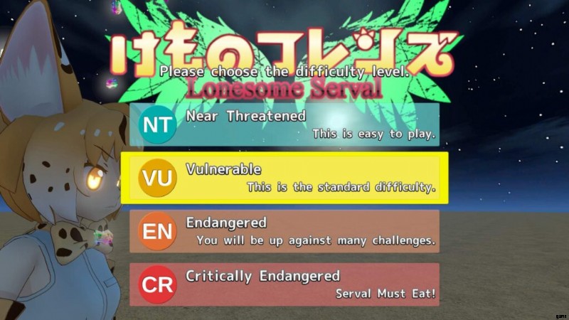 ニューゲームを選択後、難易度選択画面に移動し、右移動キー/方向を10回押します。正しく行うと、画面の左側に別のサーバルが表示されます。その後、難易度を選択するとショートストーリーでアナザーサーバルとしてプレイできます。