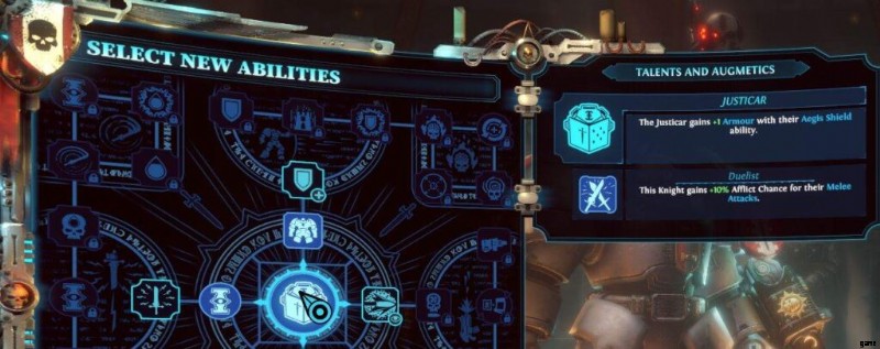 ゲームの過程で、ナイトは「タレント」と呼ばれるいくつかの受動的な特典を獲得します。これは、タレント ツリーの中央のキャップストーンにカーソルを合わせると表示されます。それらを取得するには 4 つの方法があります:一部はクラスに固有のものであり、すべてのナイトはランダムに割り当てられた 1 つのパッシブなタレントで作成されます。ゲームの後半で、船のアポセカリオンに外科ユニットを構築すると、戦闘中に重傷を負った騎士は、回復すると「オーグメティクス」を取得します。そして最後に、騎士に追加のボーナスを与える稀なランダム イベントがあります。