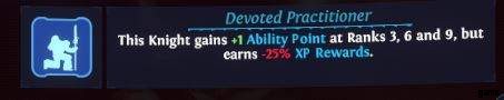 - 献身的なプラクティショナー – ランク 3、5、9 で追加のアビリティ ポイントを 1 ポイント獲得しますが、XP は -25% になります。