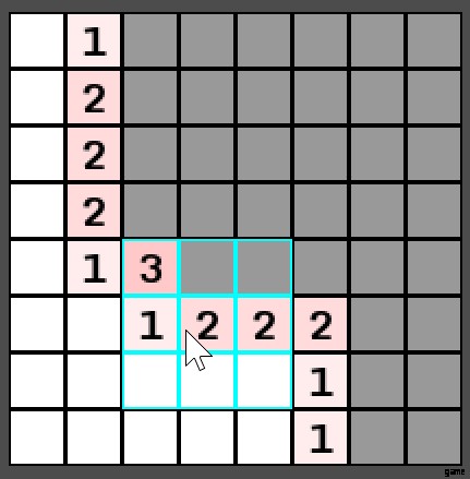 画像でわかるように、番号 2 の上にカーソルを置いています。つまり、強調表示されたセクションに 2 つの爆弾があります。それらに印を付けると、その隣の 2 つがすでに 2 つの爆弾に触れているので、その右上のタイルは爆弾ではなく、安全に裏返すことができます。