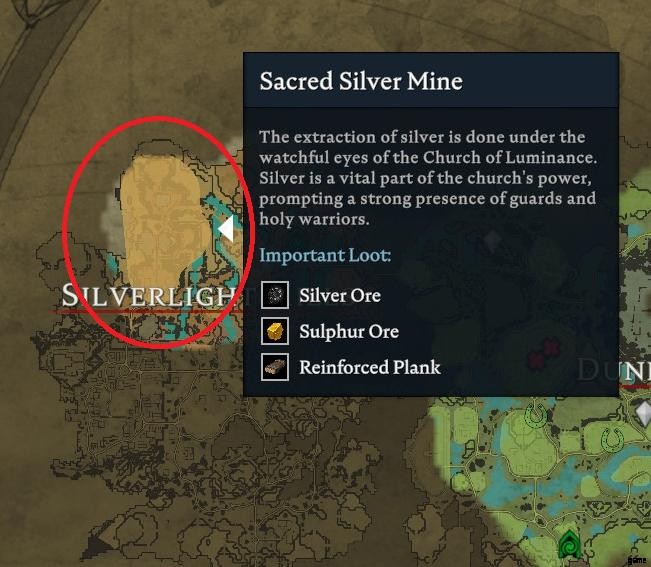 - 入手場所:シルバーライト ヒルズ エリアまたは聖なる銀鉱山 (シルバーライト ヒルズのゾーン) で銀鉱石を入手できます。スカージストーンは、高レベルのモブから、またはダムドの教会 (ダンリー ファームランドの北にあるスポット) で入手できます。
