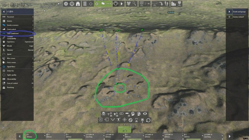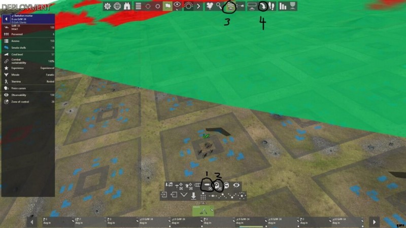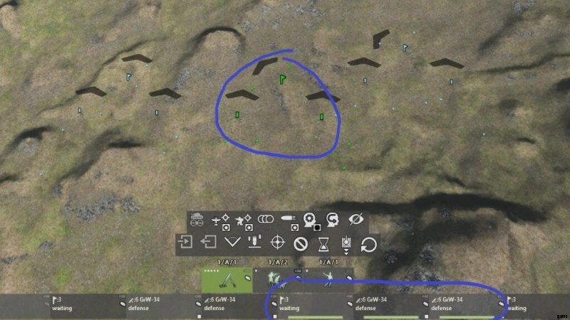 - 2 つ目は通信分隊 (青色、電話記号) です。この任務は、バッテリー内のすべての指揮官を通信に接続することです。現在、部隊指揮官と発砲小隊指揮官の間には通信がないことに注意してください (左を参照)。手の UI)。 AI 操作がオンになっている限り (デフォルトではオンに設定されています)、有線分隊は自動的に移動して、バッテリー コマンダーと消防小隊コマンダーの間の通信を確立します。
