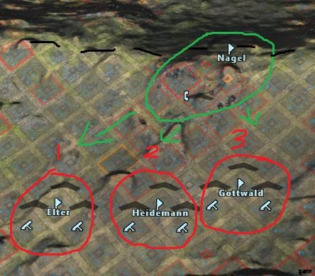 消防小隊の指揮官がそれぞれの銃の音声範囲内にない場合、つまりゴットヴァルトが 1 と 2 でエルターと場所を入れ替えた場合、銃は手動で選択されたエリアで発砲しません (つまり、すべての銃が発砲しません)。適切な司令官による銃。