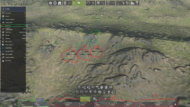 - 3 つ目は個々の射撃小隊 (赤) で、この砲台には 3 つの射撃小隊があります (各射撃小隊には独自の指揮官 (エルター、ハイデマン、ゴットヴァルト) とその下に 2 つの迫撃砲 (合計 6 門) があります)。手動の射撃任務に従事したい場合は、それぞれの射撃小隊の指揮官を銃の近くに置いておくことが重要です.手動射撃。射撃するエリアを手動で選択することを気にしない場合は、これを無視できます。バッテリー内の任意の指揮官の音声通信範囲内に砲兵を配置することだけを考えてください。