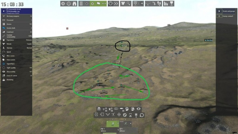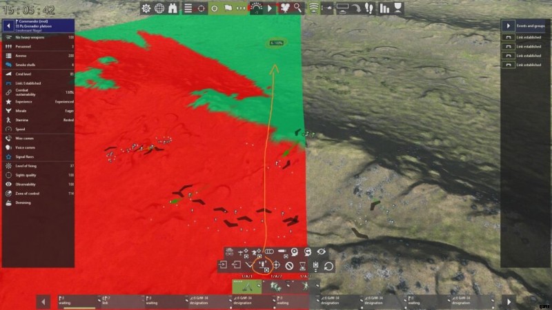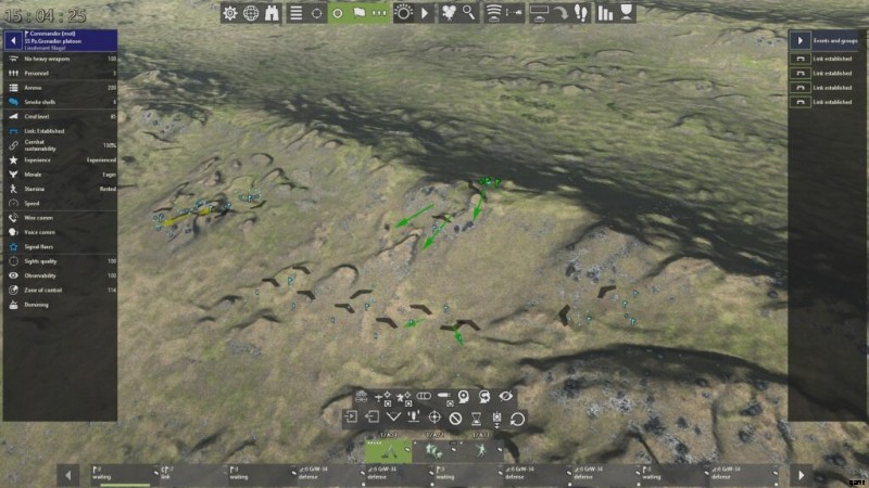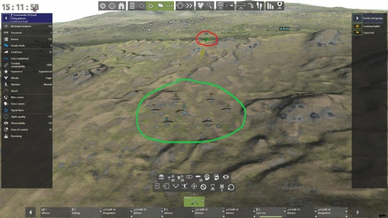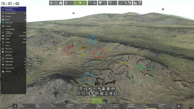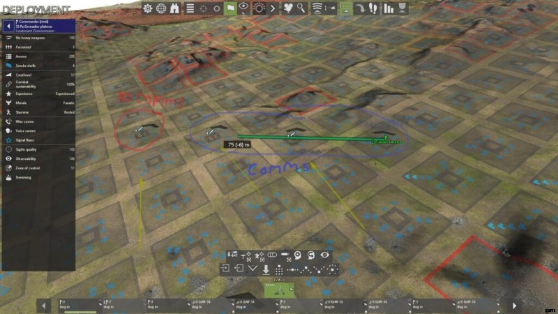 通常、中隊が塹壕化されていない限り (作戦マップ上で 1 ターン静止する)、指揮官同士の通信は開始されません。消防小隊の指揮官と後続の砲兵隊が監視員間で音声通信や有線通信を確立しておらず、目標に対する LOS も確立されていない場合、射撃任務を遂行することはできません。これを回避する 1 つの方法は、小隊の指揮官を LOS の位置に配置し、大砲を 2 タイル以内に配置して、音声通信を介して間接射撃を行うことです。