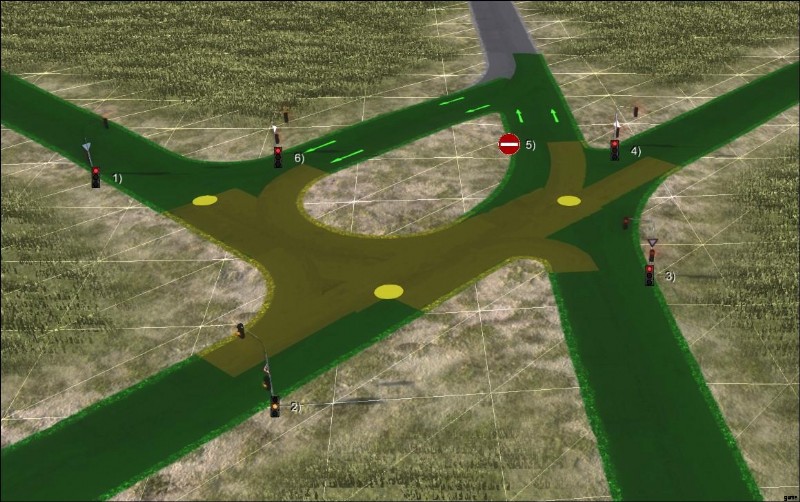 The same four way intersection, with a basic two active green lights setup. The priority signs are still there, in case the electricity goes out.