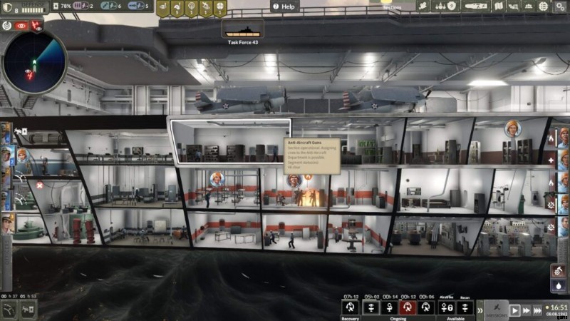 攻撃が発生すると、対空砲が作動し、関連する攻撃がレーダーから消え、最終的に攻撃機とその爆弾が画面上で点滅するのが見えます。アクティブな CAP ミッションが進行中の場合、CAP が敵軍と絡み合っており、損傷を受けている可能性があることを示す中央画面のポップアップが表示されます。それを却下すると、最初のアクティブな損傷の通知が届きます。船の外側に警報ベル、画面の揺れ、目に見える爆発はありません。ナレーションは、魚雷や爆弾などに襲われたとは言っていません。たまたまセクション ビューにいる場合、いくつかの波がクラッシュしたり、小さな爆発のように見えたりすることがありますが、基本的にはスイッチが入れ替わっただけで、突然船がすべて異常になります.