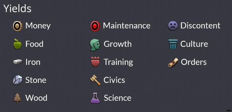 - 成長 – 成長を利用して生産されるユニット (入植者、労働者、スカウトなど) を作成するために使用されます。特別なリソース、グラナリー、特定のシュライン、または特定のスペシャリストからのみ入手できます。都市のユニット生産に使用されない成長は、市民の成長に使用されます。