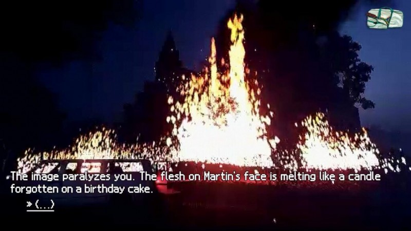 - マッチ ポイント: マーティンを焼き殺せ。バーニングマンと同じ条件。モロトフ カクテルのパーツを 2 つ入手します (バスルームでナプキンを取り、バーナードの死体からライターを取り出します)。最後に、マリーと一緒に行く代わりに、モロトフ カクテルを飲むことを選択します。最後に、双子と一緒に行くことを選択します。