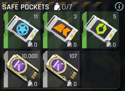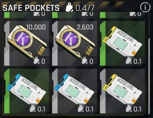 あなたが保管できる他の、あまり目立たない0重量のアイテムはscripsです。仕事やミッションを完了するたびに、新しいスクリップをセーフ ポケットに入れる必要がありますが、スロットが 3 つ増えるので、それだけの価値があると思います。