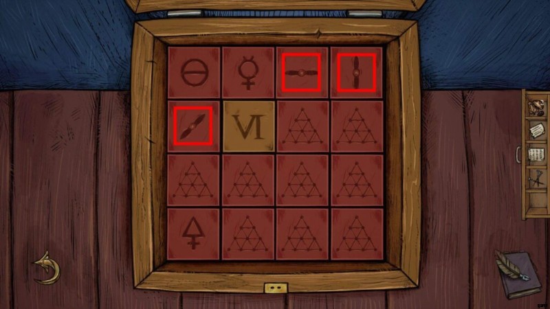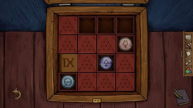- (skippable in the second playthrough) Place the colored discs on the wooden box puzzle from the top shelf (green on top, blue in the bottom left, red in the bottom right slot) to see their corresponding symbols, then pick them up again.