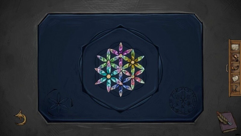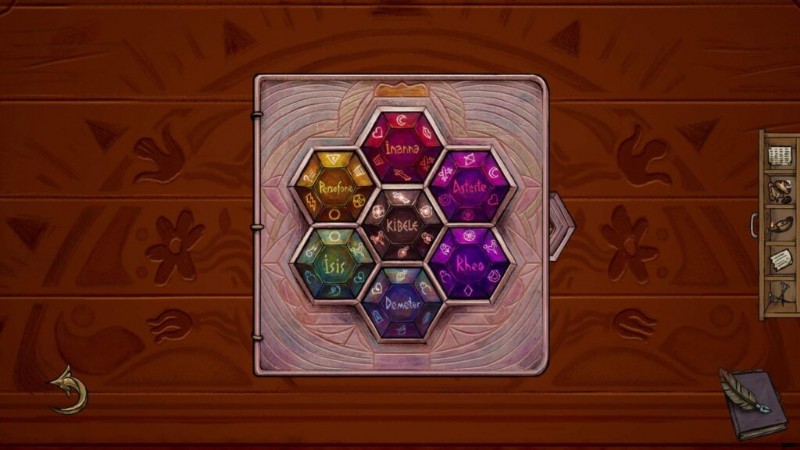 - 女神の名前が書かれた宝石を、Cybele ボックスに配置します (正しい位置にあると、中央の六角形にアイコンが点灯します)。クリックすると、本のページが表示されます。