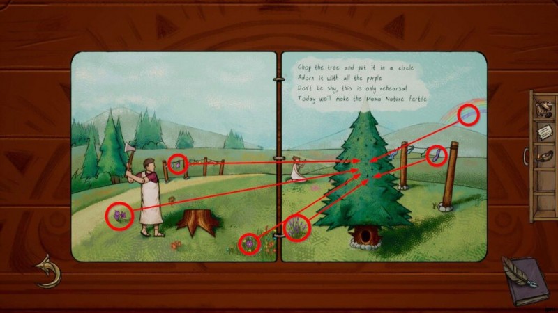 - 右側のページ (座っている女性の前) から斧を取り、左側の男性に渡します。