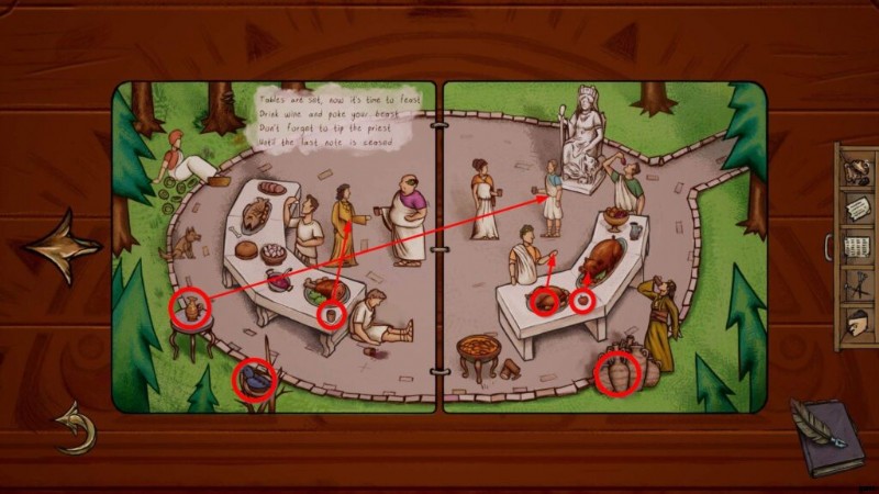 - テーブルの隅にあるマグカップを、オレンジ色のトーガを着ている人に渡します (どちらも左ページにあります)。