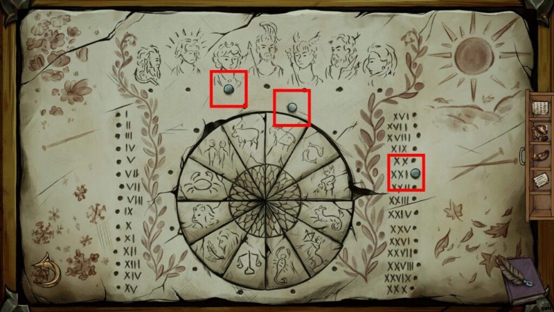 - カレンダー パズル:釘を次の位置に置きます (キュベレ パズルの最後のメモからのヒント)。次に、月の女神の石を拾います: