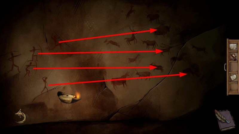 - 木の内部:石油ランプを使用して光を当て、射手を動かして、アンフォラに描かれている 4 匹の動物すべてに矢が当たるようにします。次に、一番左の射手 (動かせないのは 1 つだけ) を押します。射手の正しい構成を以下に示します:
